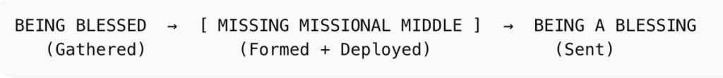 The Missing Missional Middle therefore refers to the critical but underdeveloped space between the gathered life of the church and the sent life of mission, where believers are intentionally formed, equipped, and deployed to translate spiritual vitality into missional engagement. It is the absent or weak connective ecosystem that should bridge being blessed (through worship, teaching, fellowship, and revival) with being a blessing (through participation in God’s redemptive mission in the world).